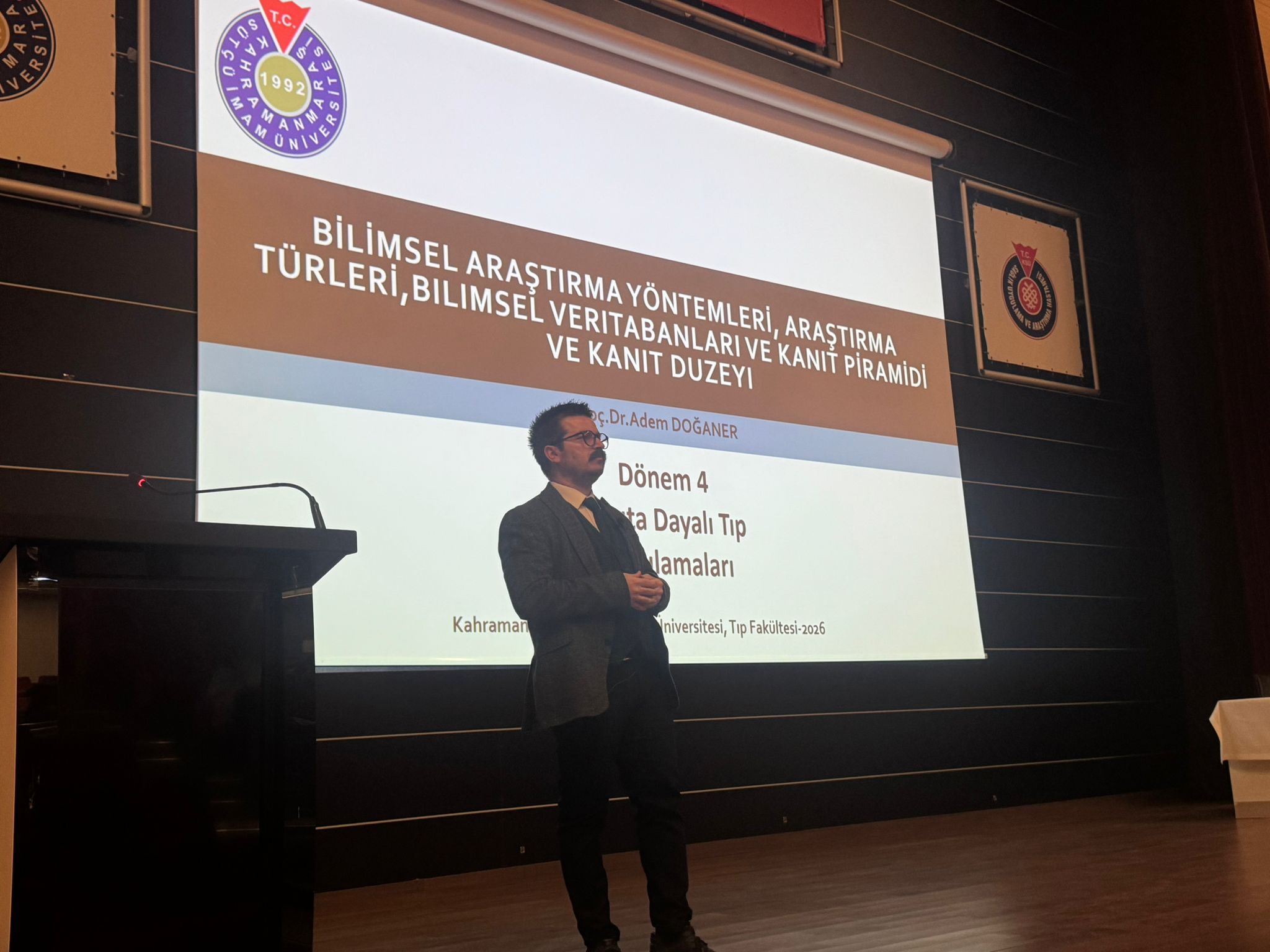 Tıp Fakültesi öğrencilerinin klinik karar alma süreçlerinde güncel ve güvenilir bilgilere ulaşma becerilerini geliştirmek amacıyla, Dönem IV öğrencilerine yönelik “Kanıta Dayalı Tıp Uygulamaları” kapsamında eğitim süreci yürütülmektedir. Programın ilk aşamasında Fakültemiz Biyoistatistik ve Tıbbi Bilişim Anabilim Dalı öğretim üyesi Doç. Dr. Adem Doğaner tarafından 10 Mart 2026 tarihinde literatür tarama, makale inceleme ve bilimsel verilerin kanıt düzeyine göre değerlendirilmesine ilişkin genel bilgilendirme yapılmıştır.