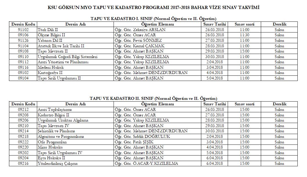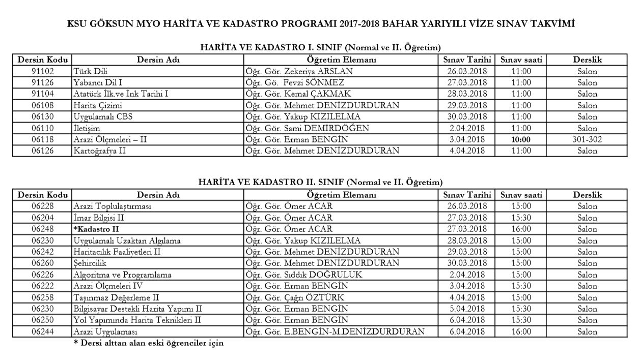 2017-2018 Bahar Dönemi Vize Sınavı Tarihleri