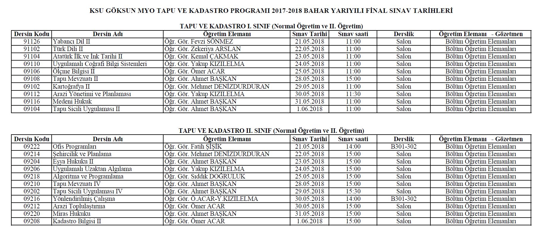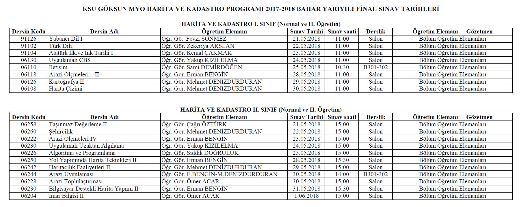 2017-2018 Bahar Dönemi Final Sınavı Tarihleri