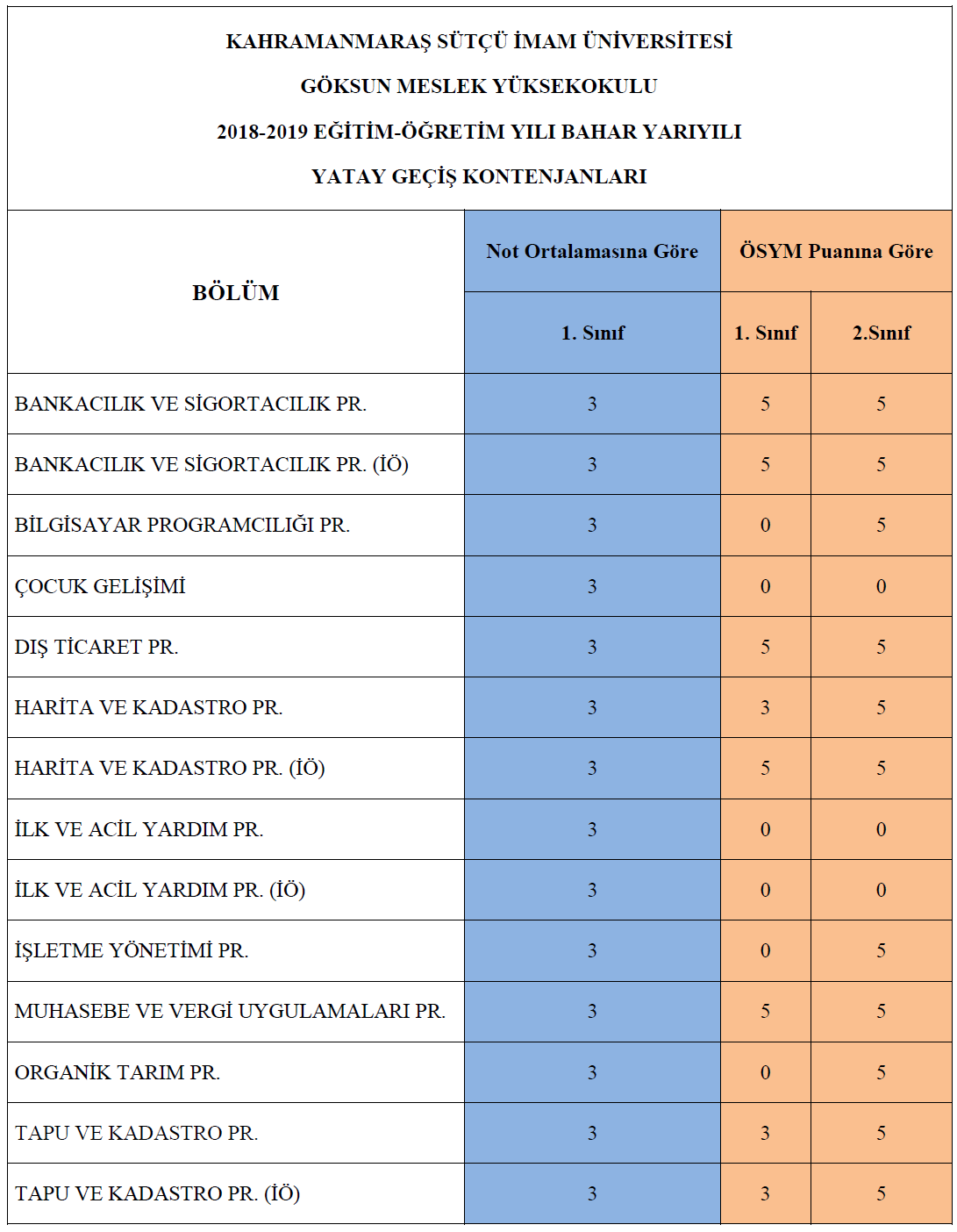 Göksun Meslek Yüksekokulu 2018-2019 eğitim-öğretim yılı bahar dönemi yatay geçiş kontenjanları aşağıdaki gibidir.