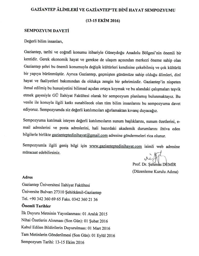 Gaziantep Üniversitesi İlahiyat Fakültesince 13-15 EKİM 2016 tarihleri arasında ' Gaziantep Alimleri ve Gaziantep' te Dini Hayat ' başlıklı sempozyum düzenlenmiştir. Sempozyum ile ilgili davet mektubu aşağıdadır.