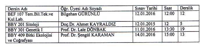 1- BİYOLOJİ BÖLÜM BAŞKANLIĞINCA BELİRLENEN SINAVLAR VE UYGULAMA TARİHLERİ