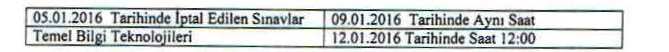 05 OCAK 2016 SALI GÜNÜ HAVA MUHALEFETİ NEDENİYLE YAPILAMAYAN VE TEHİR EDİLEN SINAVLARIN TARİHLERİ BELİRLENEREK AŞAĞIDA SUNULMUŞTUR . (İlgi yazılar aşağıdaki linklerdedir.)