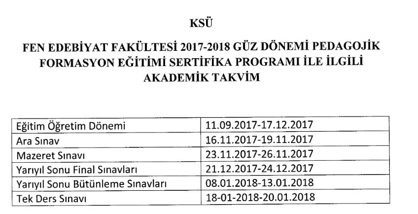 FEN EDEBİYAT FAKÜLTESİ 2017-2018 GÜZ DÖNEMİ PEDAGOJİK FORMASYON EĞİTİM SERTİFİKA PROGRAMI İLE İLGİLİ DUYURU
