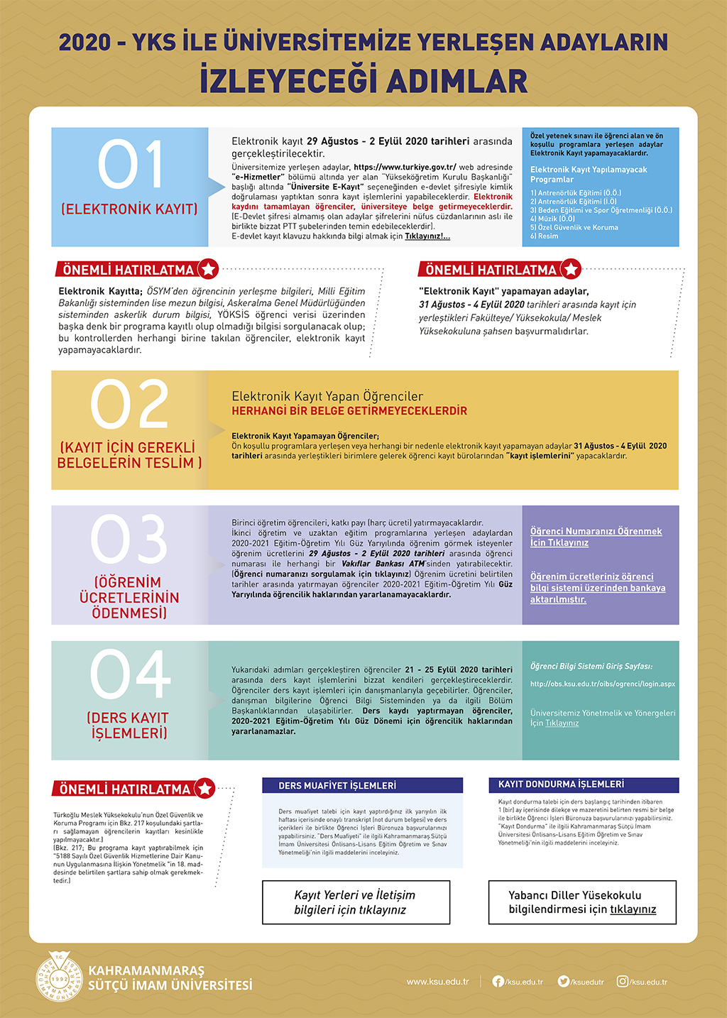 2020 Yükseköğretim Kurumları Sınavı (YKS) sonuçlarına göre Üniversitemize kayıt hakkı kazanan adayların elektronik kayıt işlemleri 29 Ağustos-02 Eylül 2020 tarihlerinde; Elektronik kayıt yapamayan adayların kayıtları ise 31 Ağustos-04 Eylül 2020 tarihleri arasında birimlerinizde yapılacaktır. Elektronik kayıt yapamayan veya biriminize gelerek kayıt yaptıracak olan adayların kayıt işlemleri için gerekli hazırlıkların küresel salgın nedeniyle hijyen kurallarına dikkat edilerek yapılması hususunda