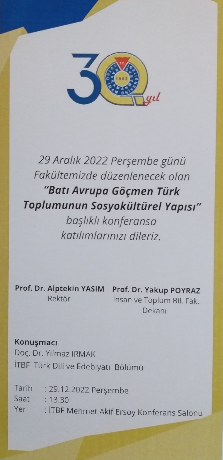 Konferans: Batı Avrupa Göçmen Türk Toplumunun Sosyokültürel Yapısı (Doç. Dr. Yılmaz IRMAK)