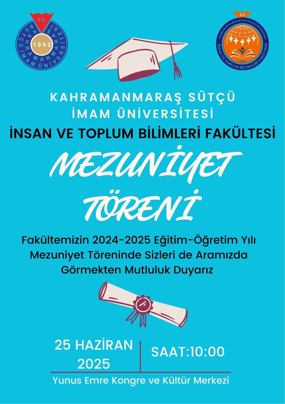 Fakültemiz 2024-2025 eğitim öğretim yılı mezuniyet töreni “25 Haziran 2025 tarihinde Çarşamba günü Saat 10.00’da KSÜ Yunus Emre Kongre ve Kültür Merkezi Sezai Karakoç Konferans Salonunda” öğrenci ve öğrenci yakınlarının katılımı ile yapılacak olup, program aşağıda sunulmuştur.
